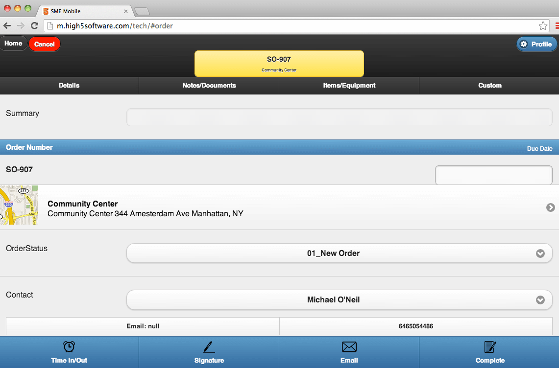 • Captures work performance details including customer contact and location, service requested, order status, customer equipment, documents, site notes, and more.